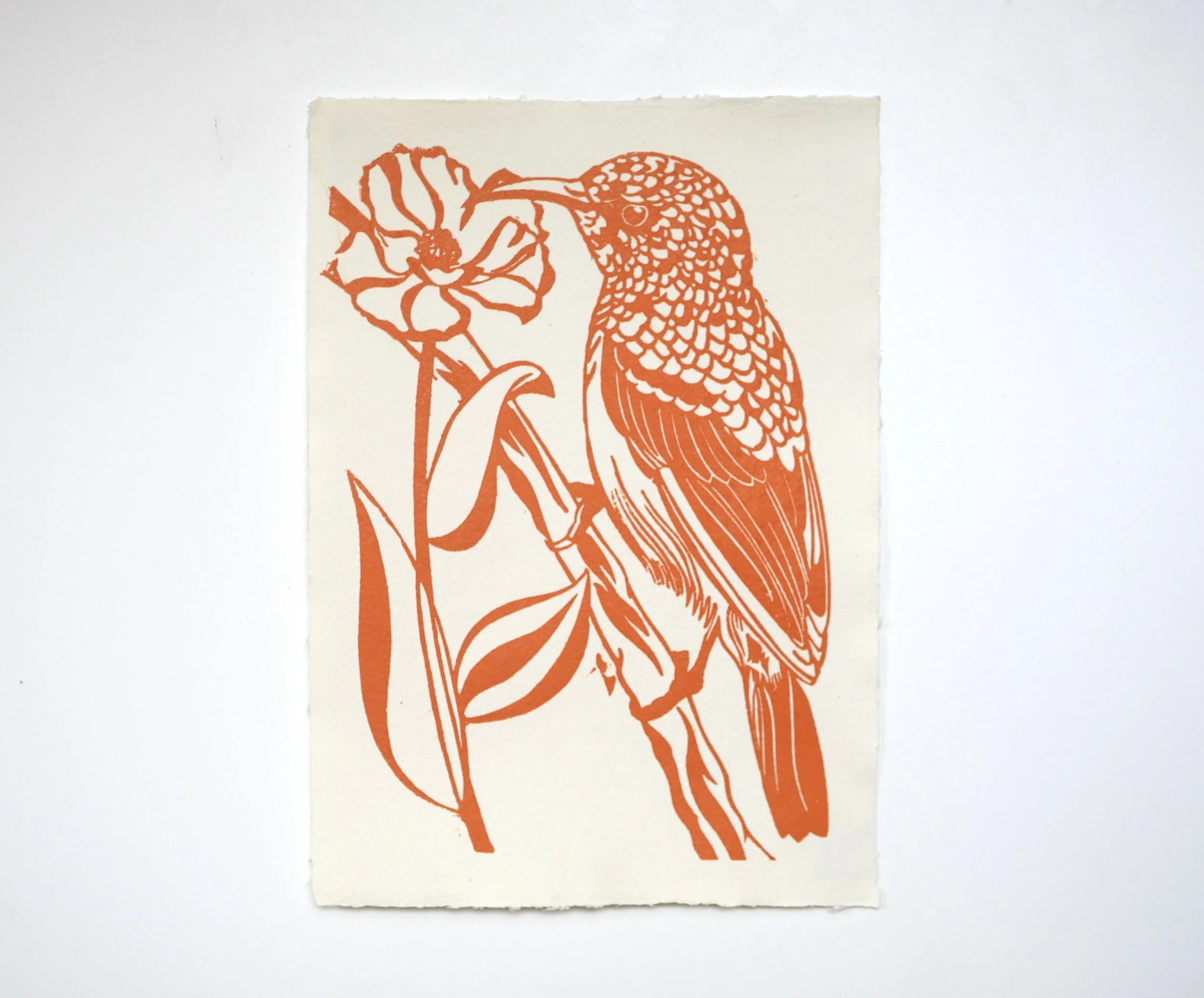 Palestine Sunbird and Anemone Coronaria, A4, Lino Print, Orange Relief Ink on Khadi Paper, 2024