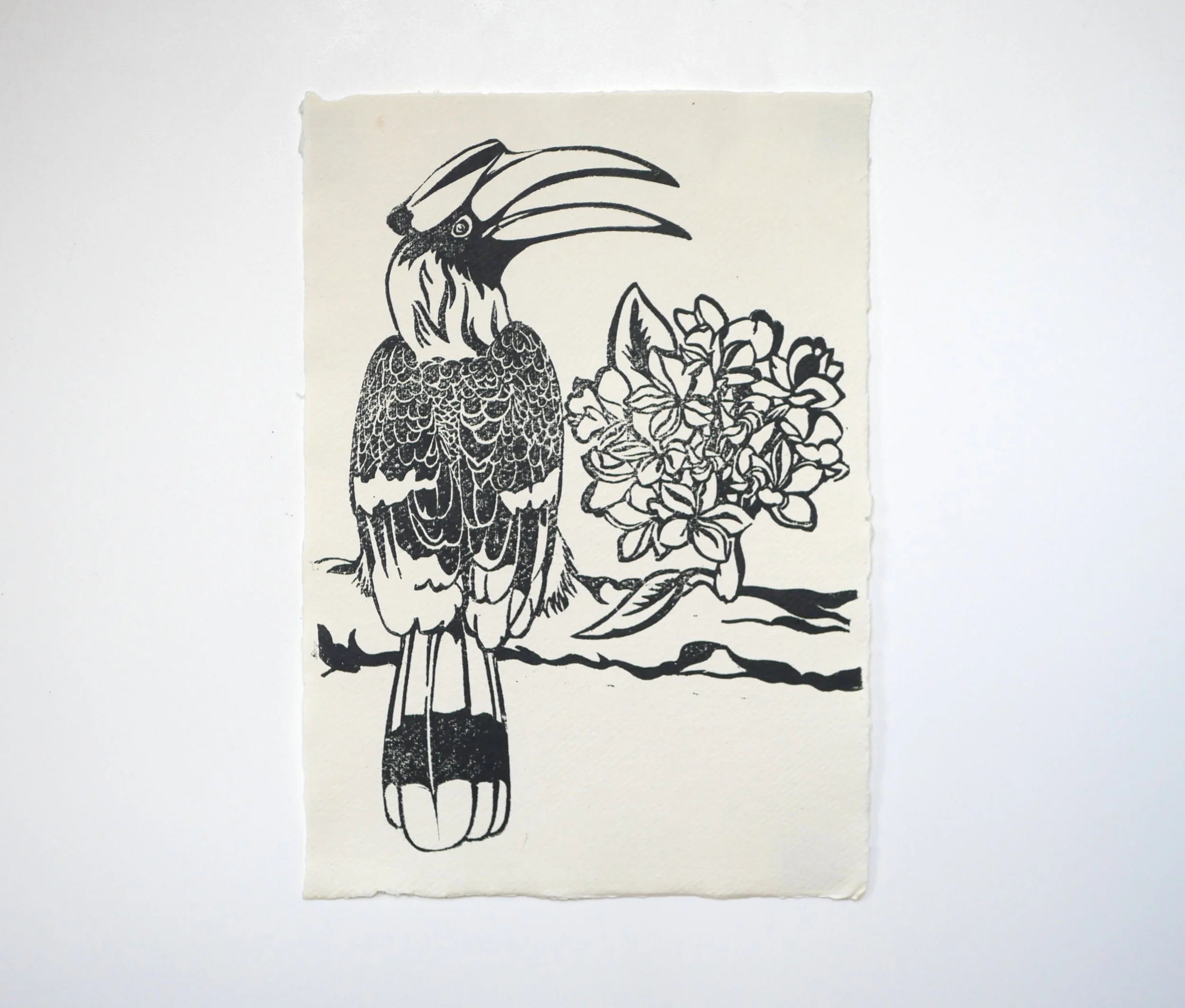 The Great Hornbill and the Red Frangipani, A4, Lino Print, Black Relief Ink on Khadi Paper, 2024