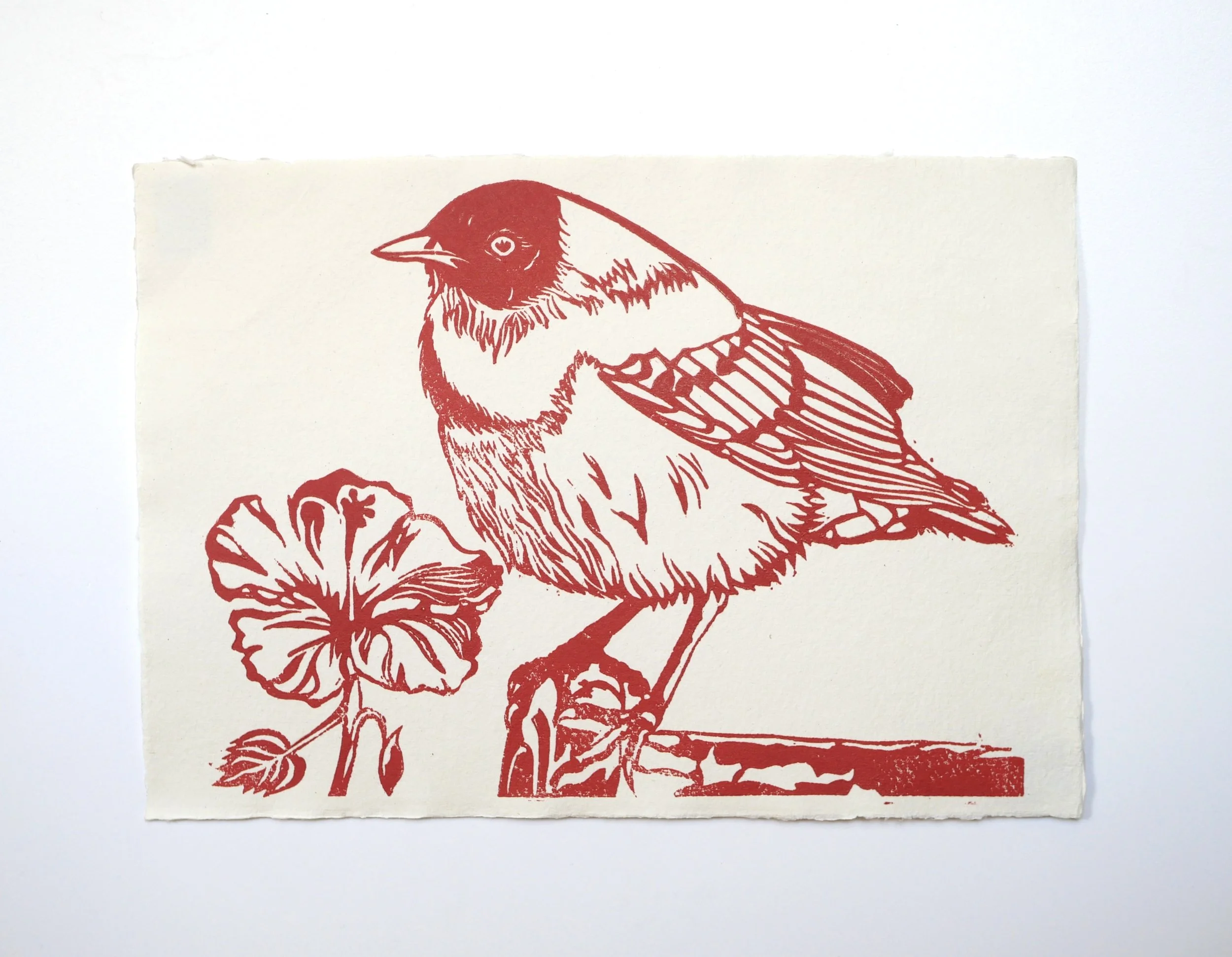 Superb Starling and Hibiscus, Lino Print, Red Relief Ink on Khadi Paper, 2024