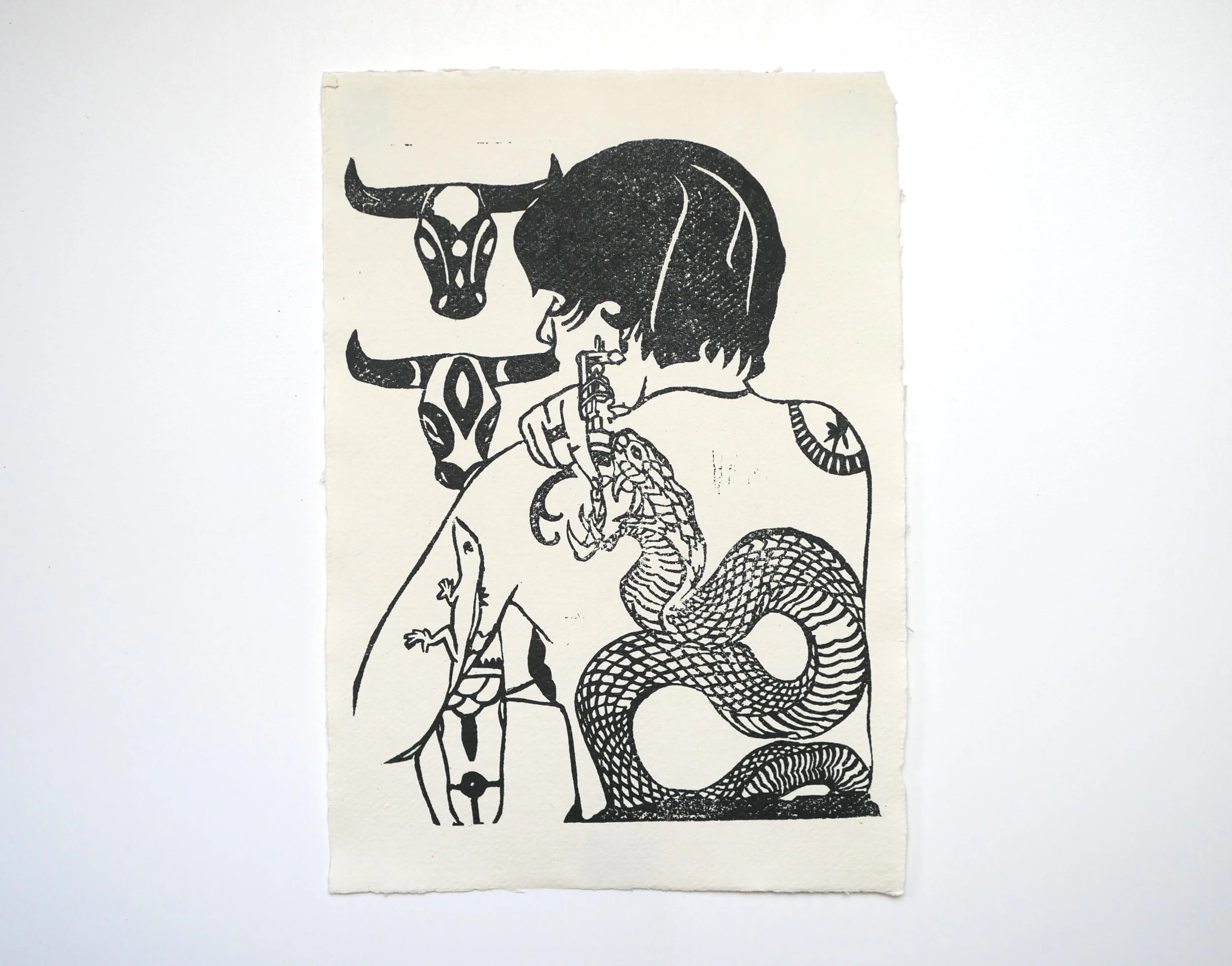 Snaked, A4, Lino Print, Black Relief Ink on Khadi Paper, 2024